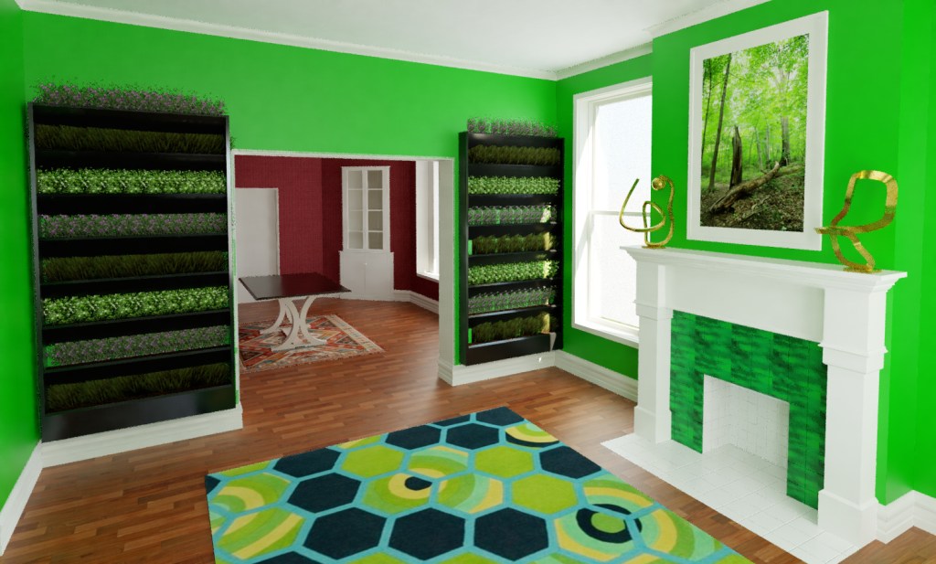 Interior designs were drawn using Revit and AutoCAD. All components (except the ceiling fan and living wall) are custom created in AutoCAD. The photos and art on the walls were conceived, built and executed by me.