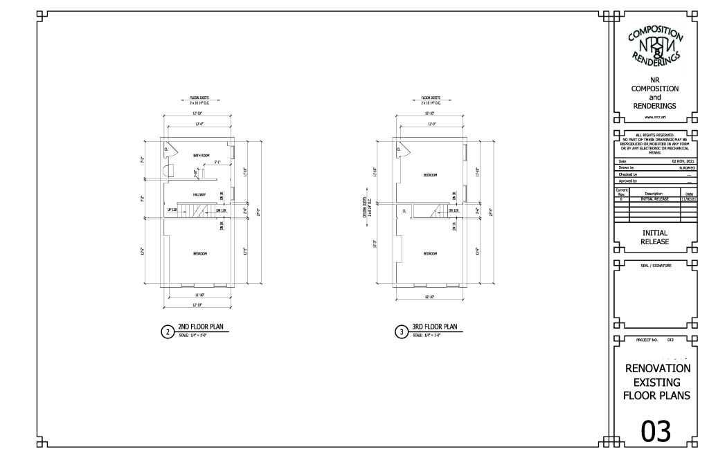This page contains existing condition surveys for renovation and home addition projects. Software used: AutoCAD, Revit, and SketchUp. The location of the projects and other identifying information have been omitted from the drawings.