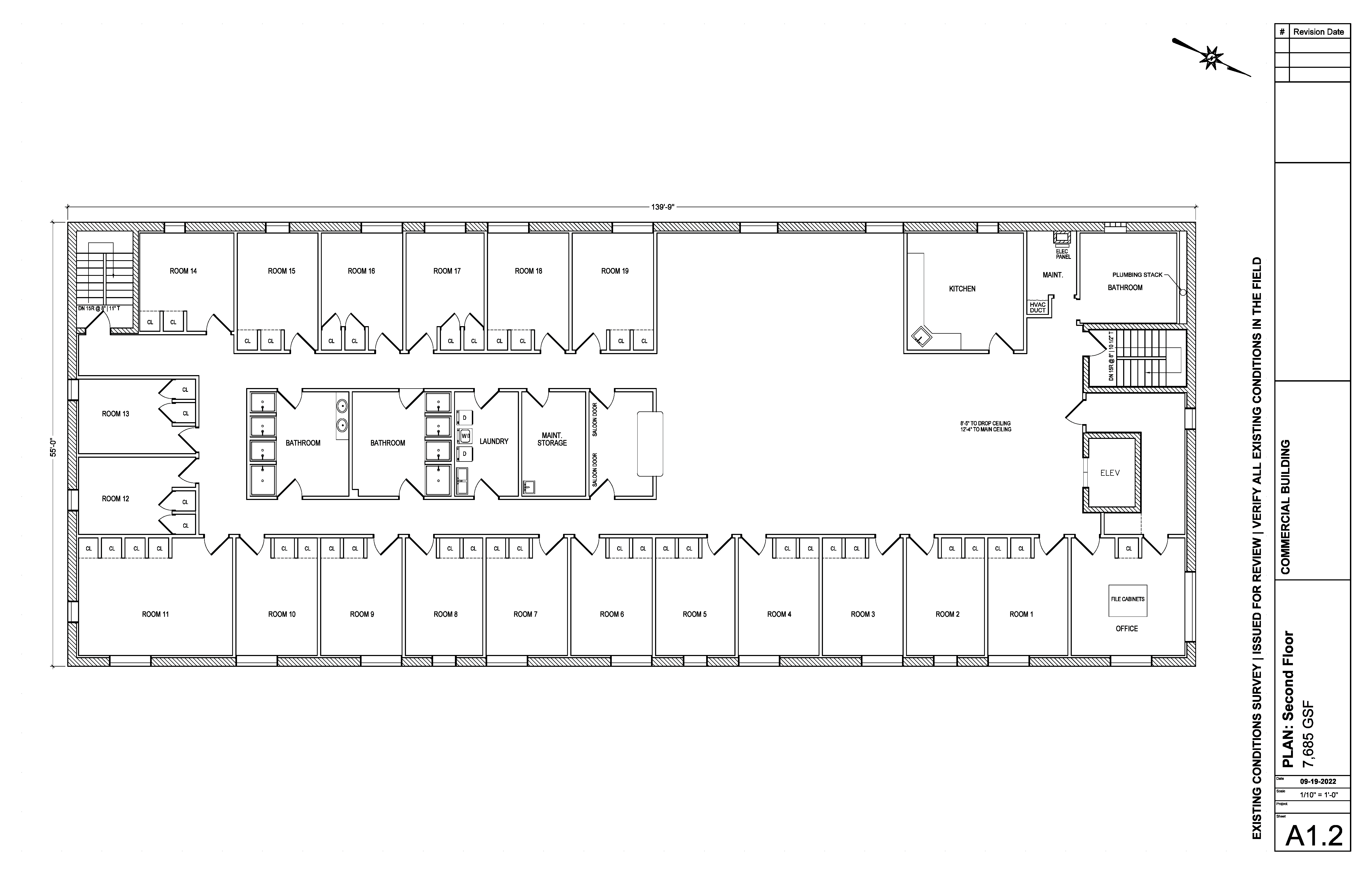Existing condition survey and staging layout drawing of a commercial property. I was asked to perceive and execute a layout to utilize the space shown. All work done in Revit R22.
